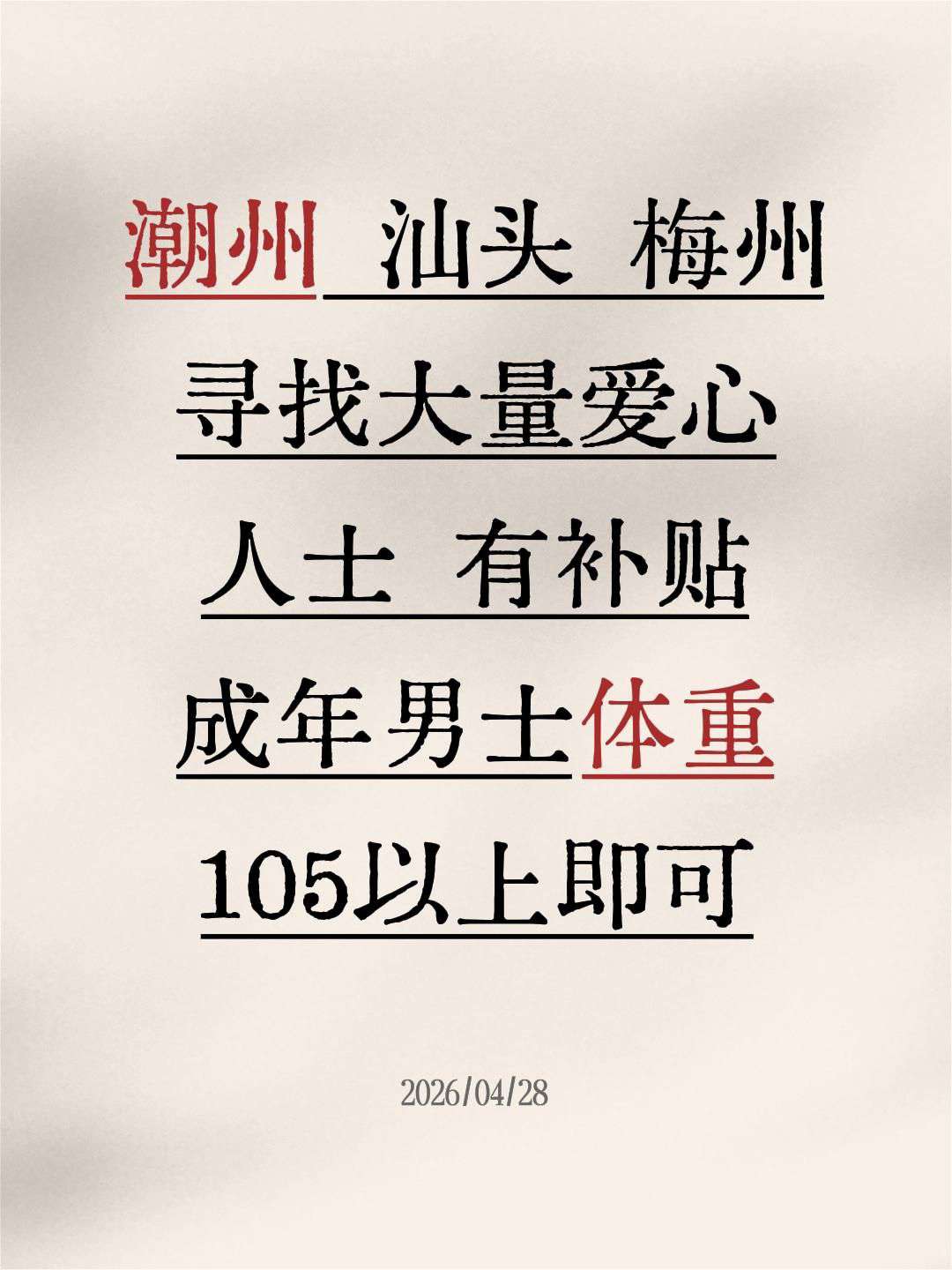 全大埔寻找爱心志愿者 当日潮州来回包接送 补贴5-6百 联系4-25广告推广